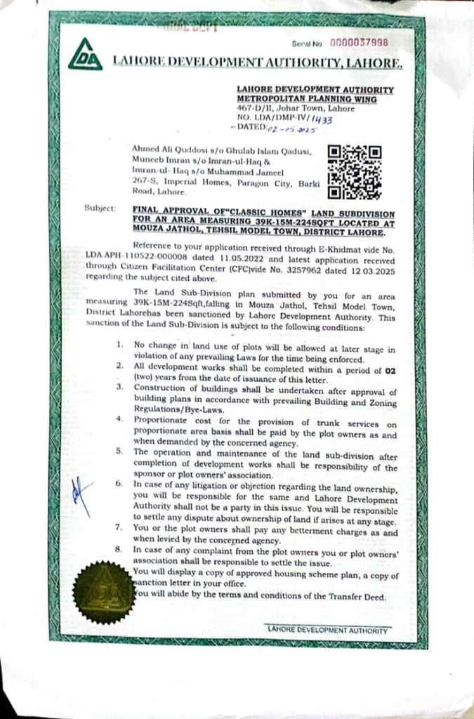Invest with confidence. Classic Homes is proud to be a fully compliant and LDA (Lahore Development Authority) Approved project. This approval guarantees that your investment is safe, legal, and adheres to all regulations.